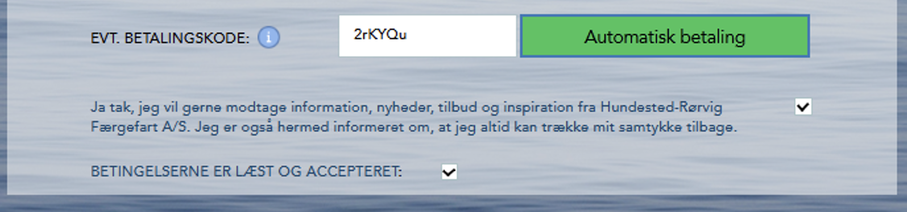 3. Du kan nu foretage nye bookinger, og ved indtastning af personlige oplysninger ligger nu din betalingskode. Tryk på den grønne knap for at indføre den som betalingsmiddel for din ordre og udnytte den tilhørende rabat.
