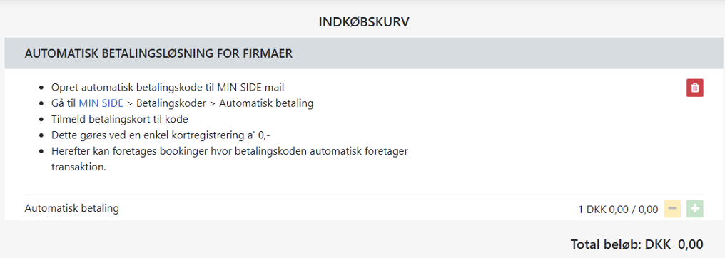 Herefter vil man ved oprettelse af bookinger kunne indføre Automatisk betaling som betalingskode. Koden er låst til din profil, og kan ikke udnyttes af andre.